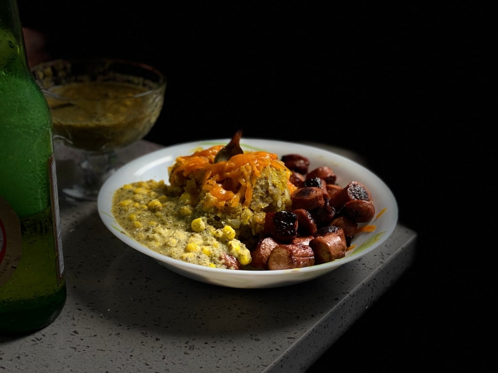 Along with fish, pork, and chicken are popular meat choices. Pudding & souse is steamed sweet potato (pudding) with spiced pork sausage (souse), making for a lovely set of contrasts.
