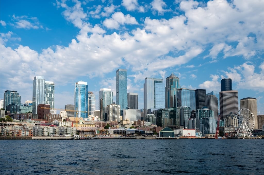 Seattle, the largest city in Washington State, lies in the far northwest of the United States and has what’s known as a sub-oceanic climate, with mild, rainy winters and mild, drier summers. The city is some 95 miles from the open Pacific Ocean, lying on the shores of Puget Sound and surrounded on all sides by mountains. The Olympic range to the west protects Seattle from the big weather systems of the Pacific Ocean.
