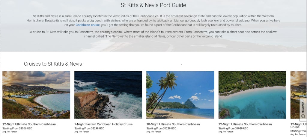 For example, if you’ve always wanted to go to St. Kitts in the Caribbean, you can visit the St. Kitts port guide on our website. You’ll be able to see the itineraries that sail there, find out about the most popular things to do around the island, click through an interactive map of the area, and read some tips on transportation, shopping, and local tipping customs.