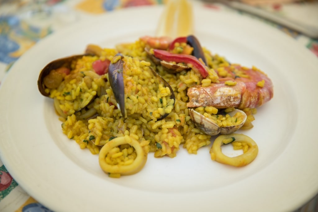 Paella is synonymous with Valencia, and you’ll find paella restaurants all over this popular European food city. Paella is traditionally made with short-grain rice from the region, stock, and saffron, which gives it a bright yellow color.