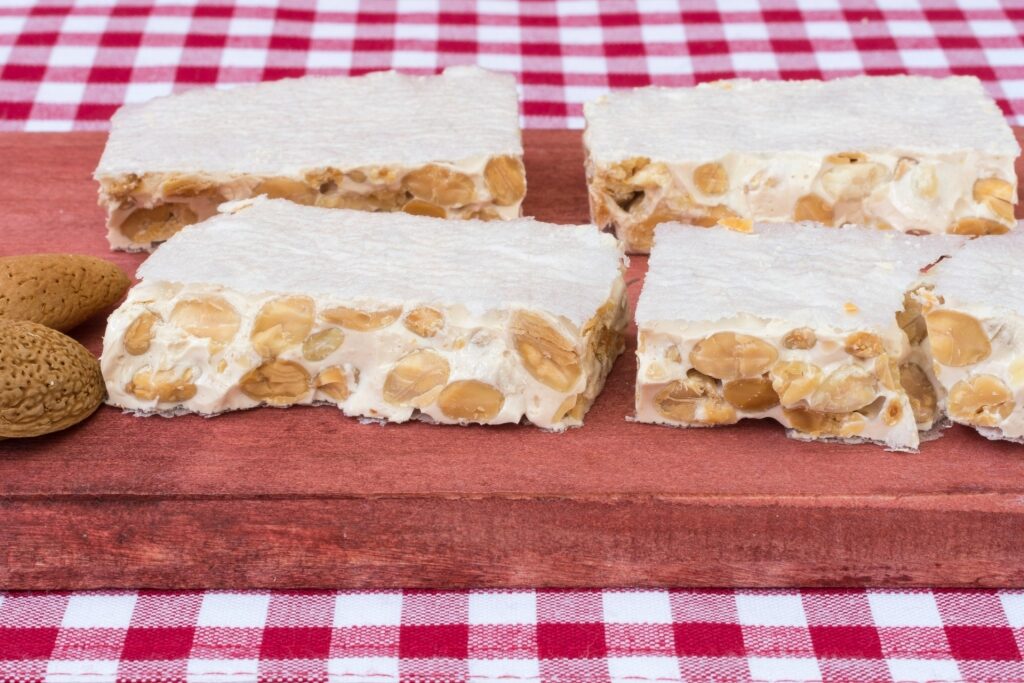 Typically a Christmas treat, turron is a kind of nougat made from almonds, honey, and sugar and flavored with chocolate, fruit, or more almonds.