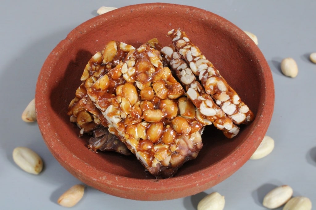 The recipe calls for bringing sugar, ginger, and water to a boil, stirring until the liquid forms a thick syrup that is poured over the peanuts. Then, the candy maker spoons out clumps of the sweet treat to cool. You can find groundnut sugar cakes in markets, bakeries, and from street vendors.