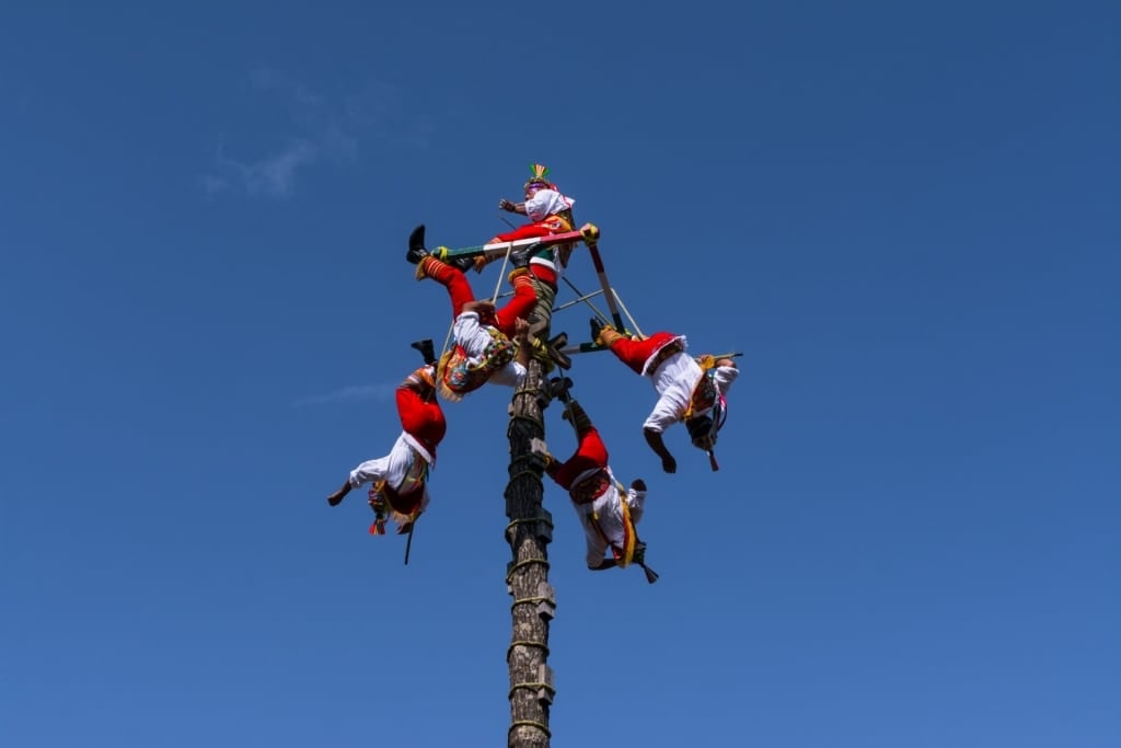 The flying birdmen of Malecon, who are adorned in vibrant traditional garb, work their way up to the top of the pole, then to the sound of accompanying flute music, uncoil around the pole in a graceful display.