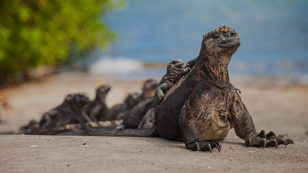 Go to SiteMarine Iguanas spend much of their lives sunbathing on the islands’ dark rocky shores. These are the only true marine or sea-going iguanas in the world. They dive into the ocean to feed on algae and can stay underwater for up to forty-five minutes. Sometimes at low tide they can be seen chomping on green algae growing on rocks close to shore. Due to an excess of salt in their diet, while resting and warming up in the sun, marine iguanas periodically sneeze salt from their nose. As cold-blooded reptiles they can’t stay in the cold ocean too long and must climb out of the water and lay on the land to warm up. The marine iguana has a blunt nose, which is well shaped for feeding on algae and a flat tail to propel itself through the water.