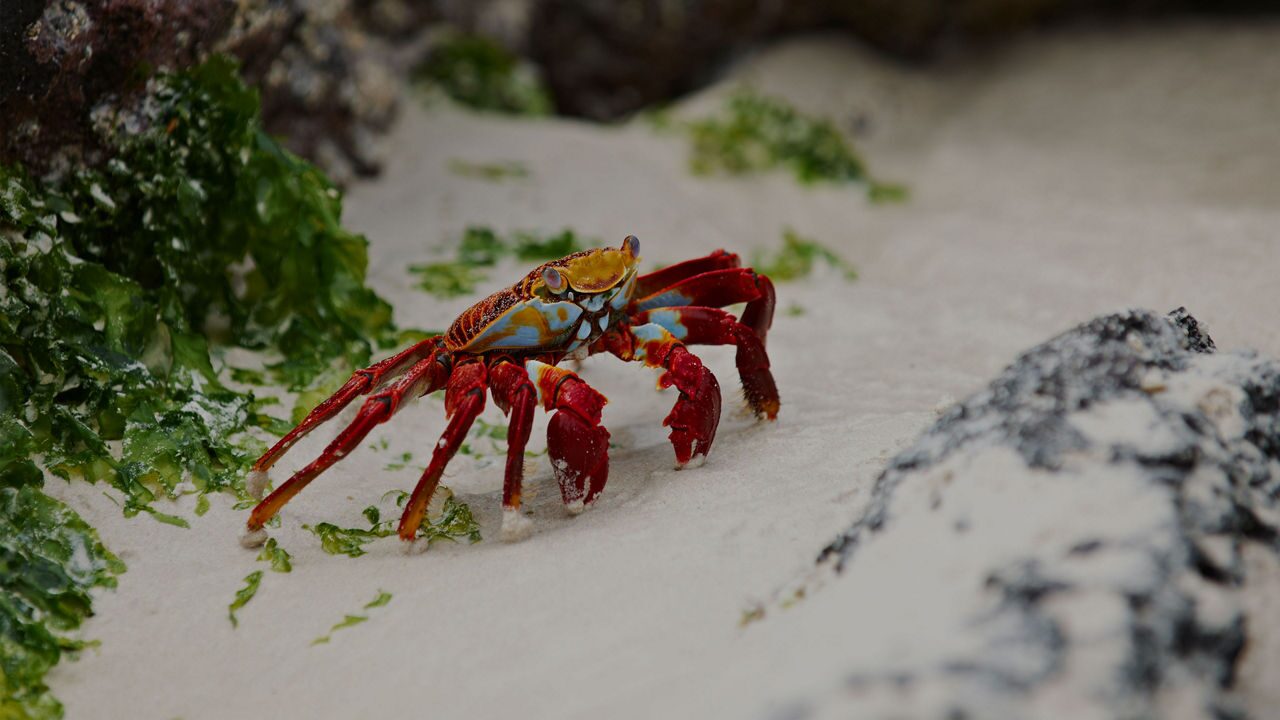 Go to SiteSally lightfoot crabs can be found throughout the rocky shores of the Galapagos Islands. This brightly colored crab lives among and on the rocks just above the water line. Young sally lightfoot crabs are black or dark brown; this provides excellent camouflage among the black lava rocks of the Galapagos Islands. When the crabs mature they turn a more vibrant shade of red and orange..