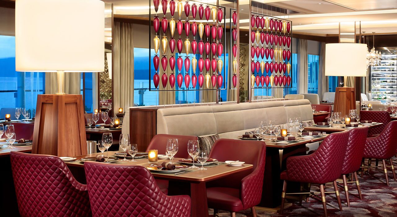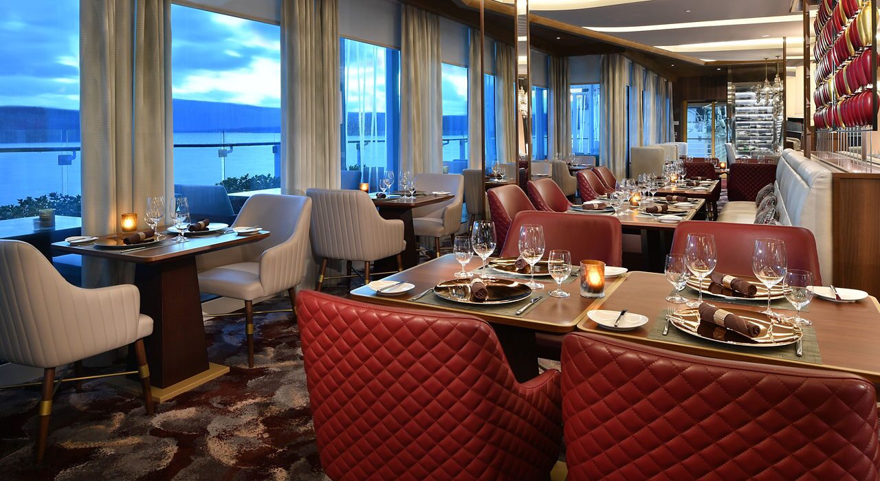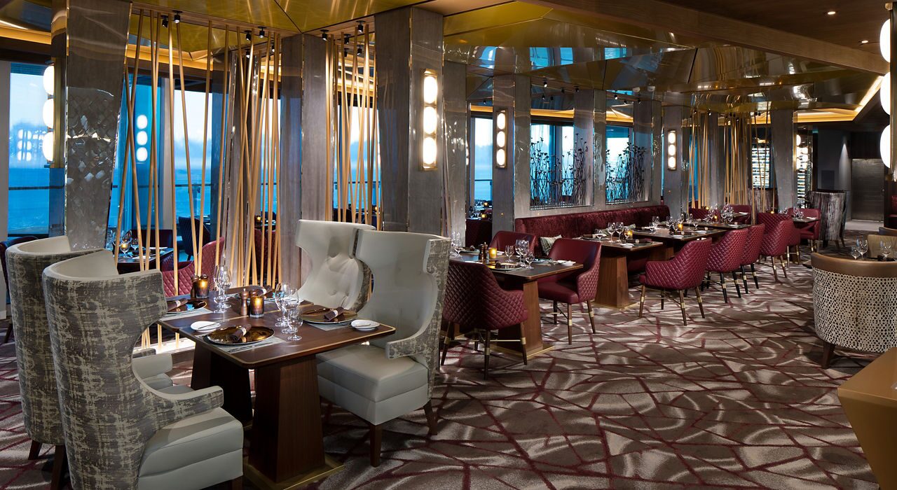 Fine Cut Steakhouse delivers an upscale dining experience for dinner with service that’s elevated to an art form and views overlooking the three-story open design on the inside of the ship and stunning al fresco seaside dining on a hedge-lined terrace that looks out over the sea. Inside, the space is warm and inviting with a glamorous palette of rich ruby, amber, and gold design element. With a wide selection of the choicest meats to the freshest, premium seafood, there’s something for everyone here, including a complete non-steak section.