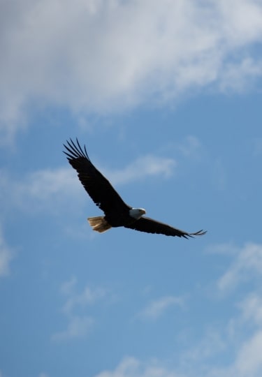 You can spot a juvenile by its all-brown or mottled brown-and-white plumage; eagles don’t get the distinctive white head and tail until they are four or five years old.