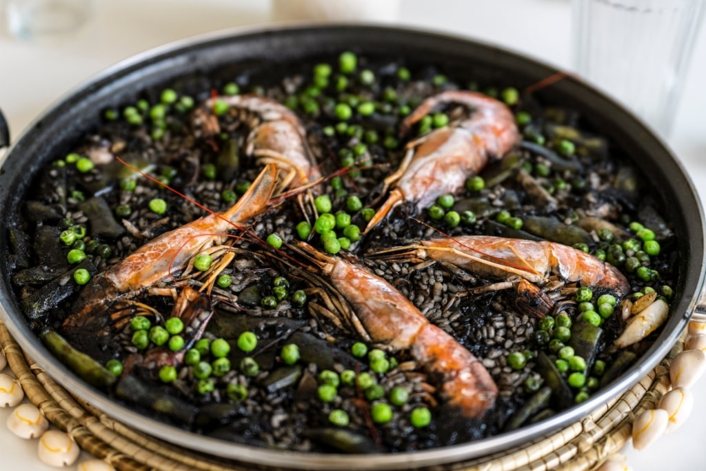This striking Catalan and Valencian dish is similar to paella, made from squid or cuttlefish and rice, with its black color coming from squid ink used in the dish. The recipe also includes garlic, green peppers, paprika, olive oil, and seafood broth or stock. You might find variations with shrimp, clams, and other seafood added.