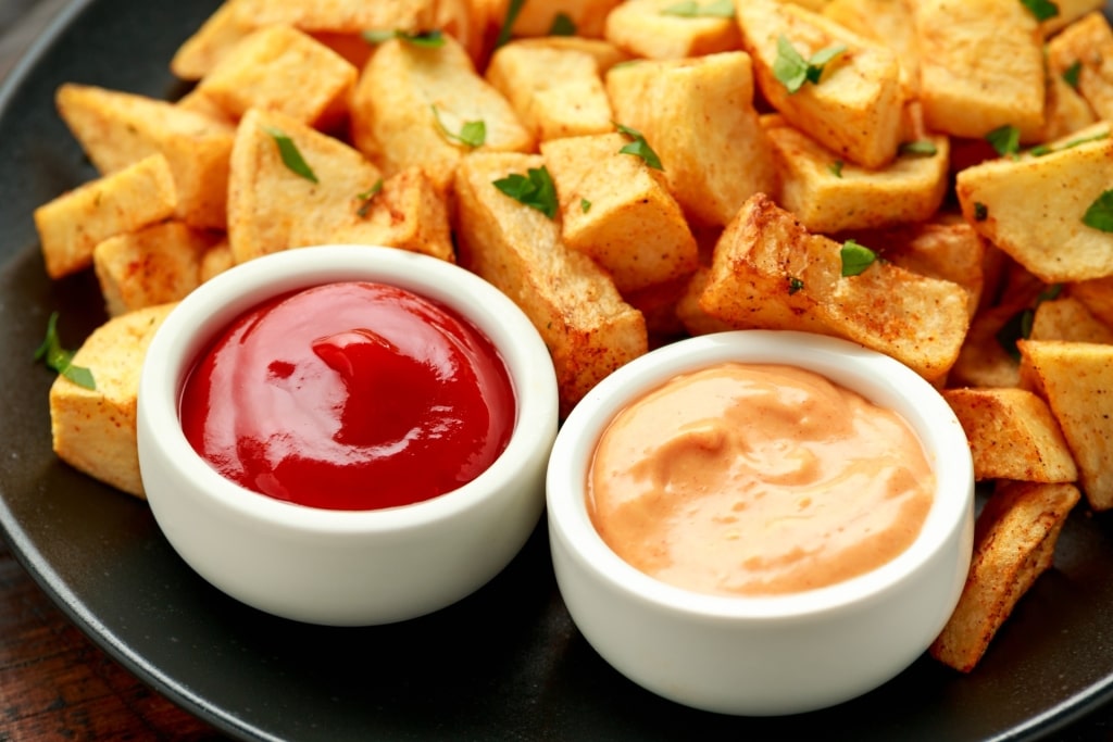 Opt for a side of divine romesco sauce, a tomato-based dip featuring toasted almonds, garlic, smoked paprika, roasted bell pepper, and a dash of sherry vinegar.