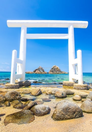 One of the coolest attractions here is the celebrated “wedded rocks,” also known as meoto iwa in Japanese, which consists of two sacred rocks joined together by a massive shimenawa rope garland, located just offshore in front of a white beachside torii gate.