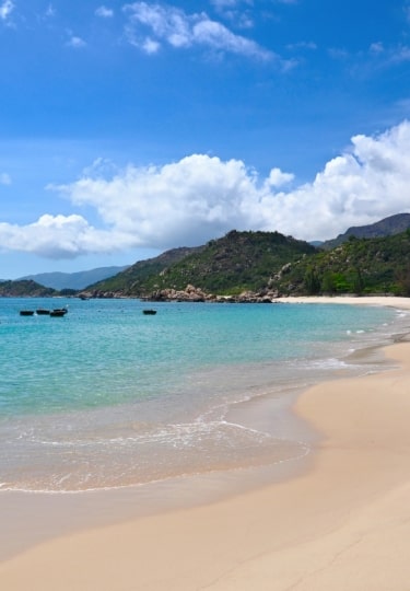 Some six miles south of downtown lies Nha Trang Beach, but it may as well be a world away. The hustle and bustle of the city backdrop is left behind in favor of a fantastic arc of the whitest sand backed by jungle-topped mountain ranges.