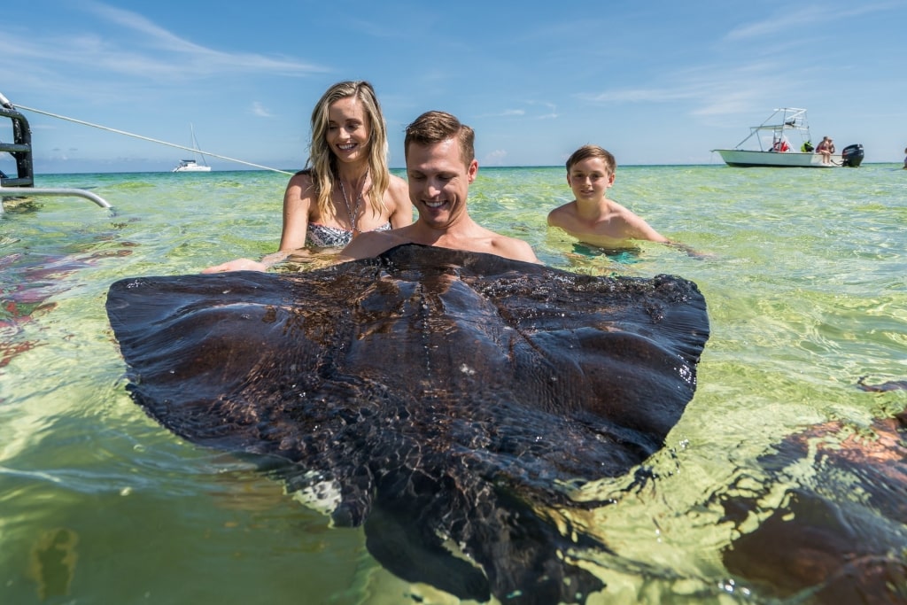 For a unique family vacation idea, head straight for Stingray City, where you can encounter five-feet-wide stingrays up close, while snorkeling with them in waist-deep water on a shallow sand bar.