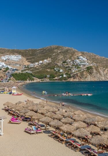 Psarou Beach, also on the south coast, is a little more relaxed. Set three miles from Mykonos Town, it’s where the celebrities and jet-setters hang out today, attracted by glamorous beach bars and places to moor their yachts as they sip sundowner cocktails overlooking the bright, white sands.