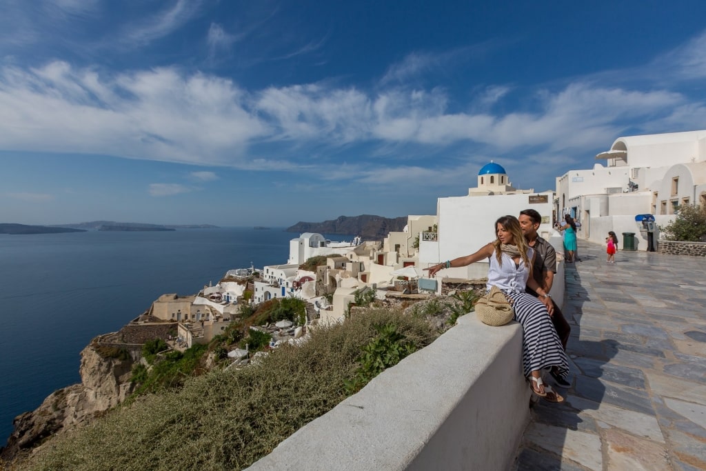 On Santorini’s precipitous crater rim, wander the narrow alleys of Oia, the starkly whitewashed cube houses and brilliant blue domes contrasting with the cobalt Aegean Sea hundreds of feet below.