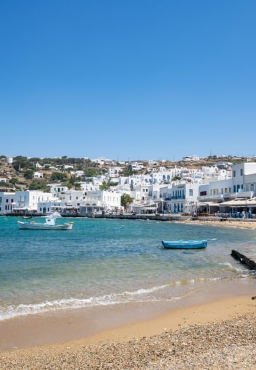 Bask on a sun lounger, swim in the azure sea, and try the watersports on Kalafatis or Elia Beach. These well-equipped shores are some of the best beaches in Mykonos, found on the island’s south coast, within easy reach of Mykonos Town.