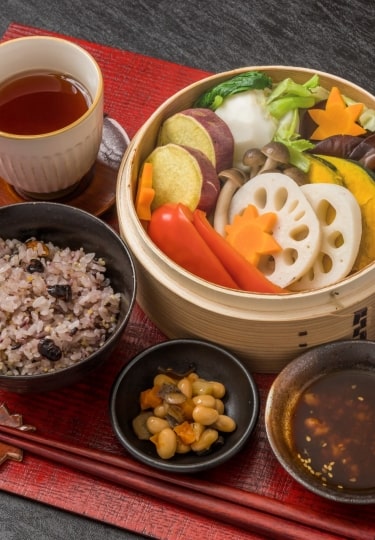 There is a concentration on fresh, highly seasonal produce, and wild plants. Every meal should be pleasing to the eye, using five colors, and tasty, using five natural flavors: sweet, sour, salty, bitter, and umami.