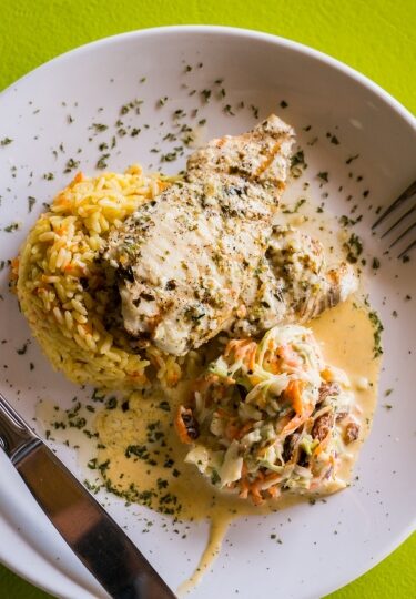 Be aware that smaller dorade has a lot of bones, so it’s maybe better to share a larger fish. It’s usually served with rice, potato fries, or a simple salad.