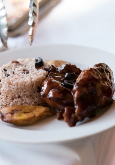 After some hours of marinating, the chicken is grilled or smoked until it chars. It’s served with sides such as rice ‘n’ peas, cornbread, or plantain.
