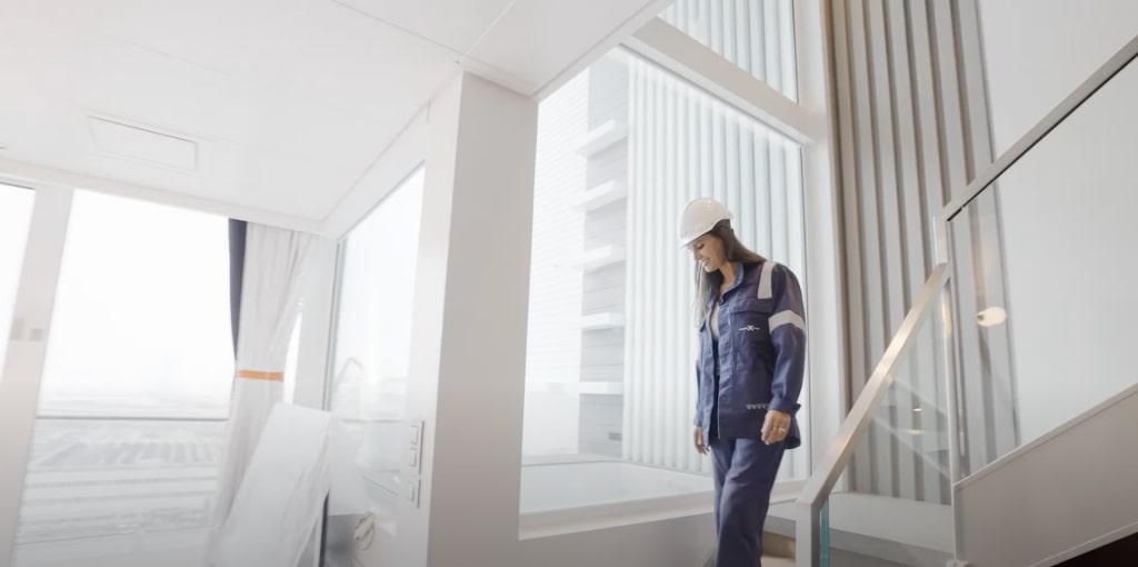 Join Captain Kate McCue as she continues her “hard hat” tour of the almost-complete Celebrity Beyond. You’ll have a first glimpse at one of the magnificent Edge Villas—ultra-luxurious accommodation spanning two decks, complete with private plunge pool and floor-to-ceiling glass. Tour the Resort Deck, complete with martini glass-shaped hot tubs and gorgeous private cabanas.