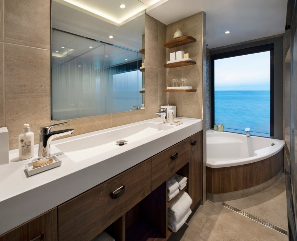 The biggest Sky Suite at 365 square feet is aptly named: the Ultimate. With an outward-facing tub and shower, you can be close to the ocean’s edge with the touch of a button in your fully automated suite. With more space than the other Sky Suites, this is an excellent option for those who crave comfort.
