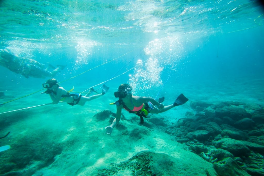 The reef is accessible from the shore and in shallow water, making it a family-friendly option and also ideal for complete snorkel beginners. There’s a roped-off area that indicates where snorkelers are welcome to explore. Angelfish, parrotfish, and stingrays often swim around the reef, and if you’re lucky, you’ll also see sea turtles swimming nearby.