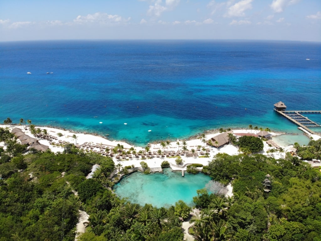 Located on Cozumel’s northwestern side, about a 10-15-minute drive north of San Miguel, Playa Azul is part of the Playa Azul Beach Club. You don’t have to be a guest of the hotel to enjoy the beach, though non-guests are usually charged a day-use fee or asked to meet a minimum spend at the bar or restaurant.