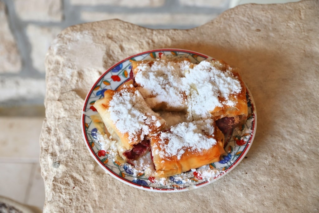 Croatians love their strudel, and savijača is a sweet version. Layered phyllo pastry is baked with cheese and a filling of apple or sour cherry (or in season, apricots), dusted with powdered sugar, and served with cream or a scoop of ice cream.