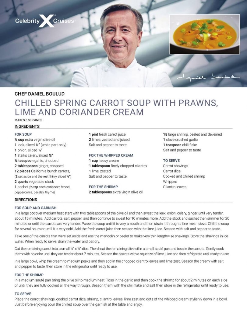 Even before you sail, experience Chef Boulud’s genius from your own kitchen with this chilled spring carrot soup with prawns, lime and coriander cream recipe. Across his restaurants, soups are featured prominently. You’ll find Andalusian gazpacho at Miami’s Boulud Sud, classic French onion soup in Bar Boulud, and pumpkin soup appetizer in New York City’s db bistro moderne.