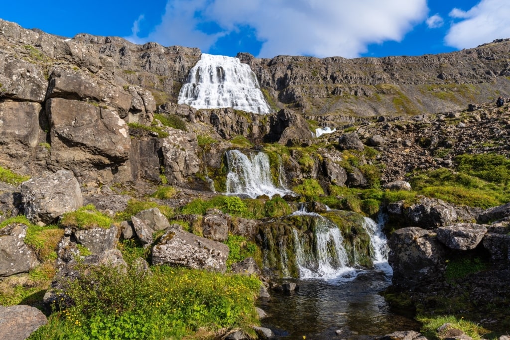 Plan a visit to Dynjandi to witness its fan-tailed drop, which spreads from around 98 feet at the top to 196 feet wide as it reaches the bottom.