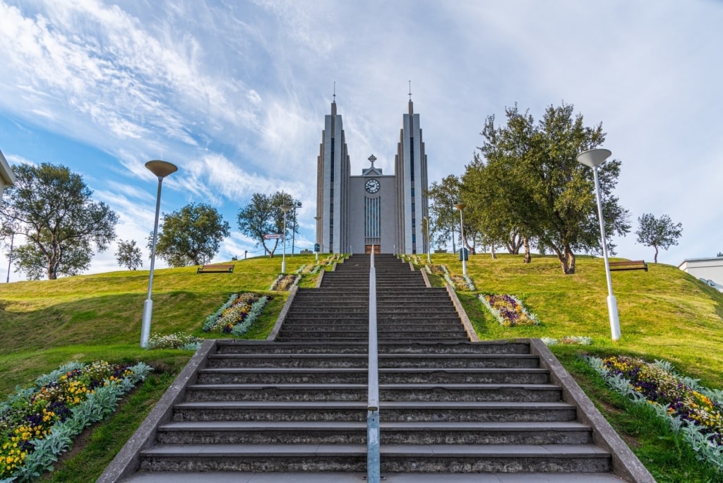 You could also visit the town’s striking Akureyrarkirkja church. Completed in 1940 and designed by architect Gudjon Samuelsson, who also masterminded Hallgrímskirkja church in downtown Reykjavík, Akureyrarkirkja looms over the town on a grassy hill.