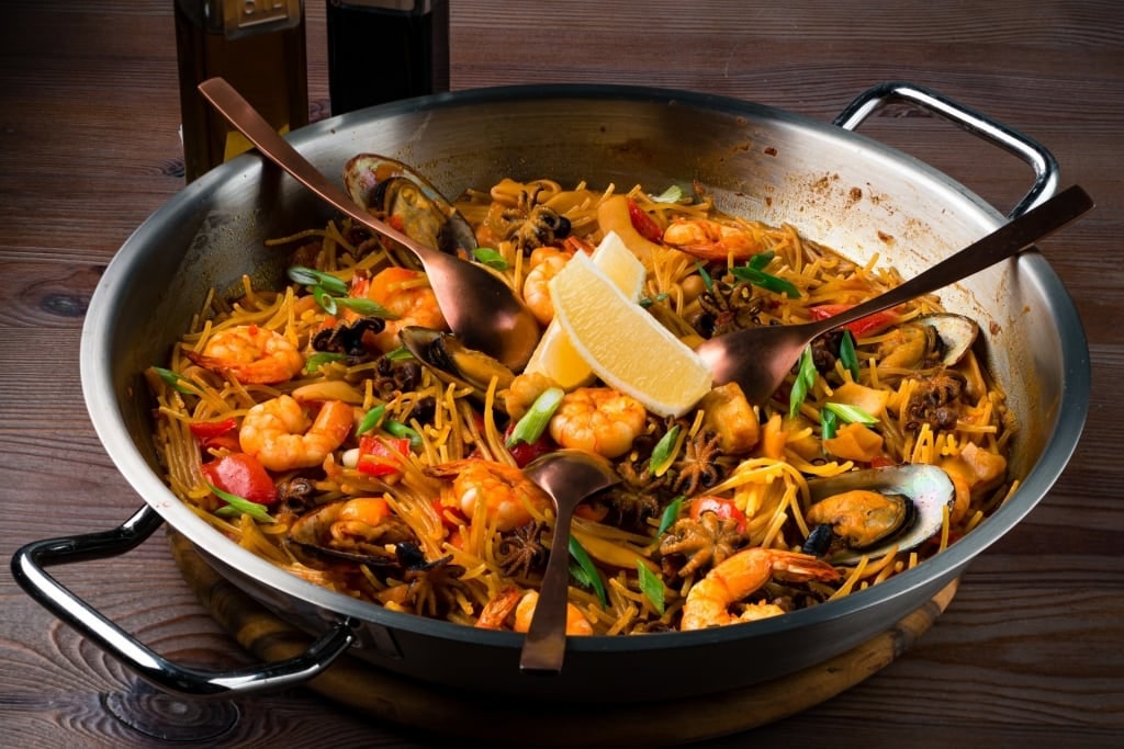 Seafood paella is rich in clams, shrimp, and mussels, while vegetarian paella comes with all kinds of creativity, featuring artichokes, beans, and red peppers, which add a dash of color.
