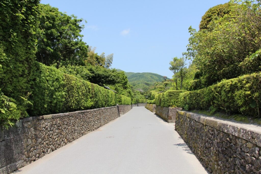 Narrow lanes are lined with stone walls topped with well-tended azalea hedges. Behind the walls are beautiful gardens, each different but most “borrowing” the view of distant Kaimondake volcano.