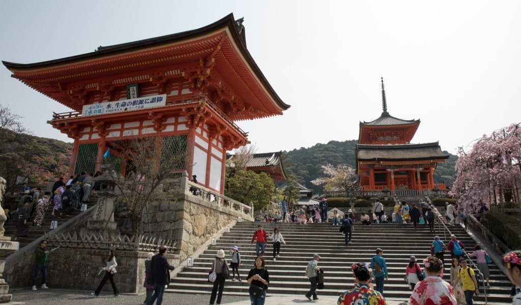 The temple complex includes the main hall, pagodas, gates, and many trees. It also holds Otowa Waterfall, where visitors drink for health, longevity, or success.