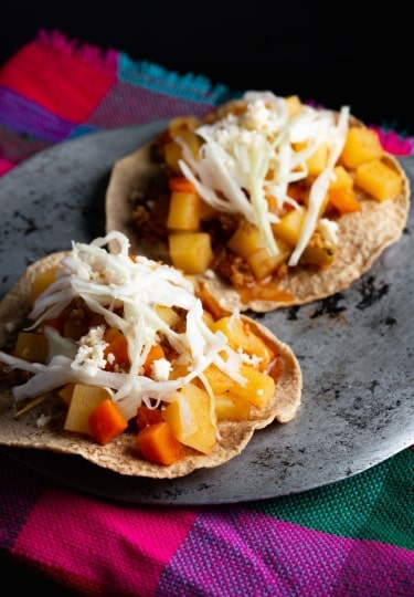 This yuca-based dish is often served as a side or an appetizer. Yuca root is boiled and combined with lemon juice and cabbage. It’s topped with pork chicharron, crispy and deep fried, and a spicy tomato sauce. Grated cheese and more cabbage may be added as toppings.