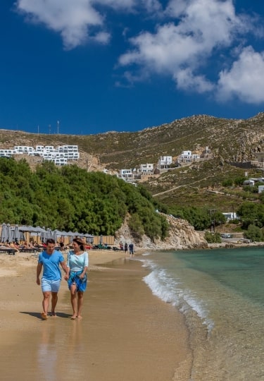 Ornos Beach is a buzzy spot thanks to the many chic, minimalist hotels that surround it. There are plenty of bars and restaurants to choose from, too if the beach becomes crowded during the height of summer.
