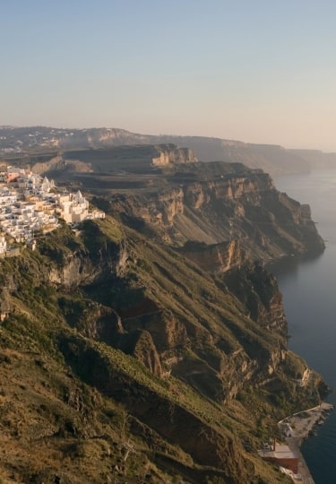 Arriving in Santorini reveals one of the most iconic sights in the whole Mediterranean: the sunken volcanic caldera with its two lava islands, Nea Kameni and Palea Kameni, still active today, shimmering in the heat haze.