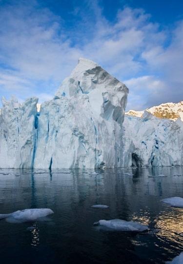 Vast tabular icebergs have steep sides and a flat top. Some have a spire in the middle like a witch’s hat, or a minaret, while others are domed like mushrooms, eroded at the waterline, the shallower water over the ice mass below the surface a brilliant aquamarine.