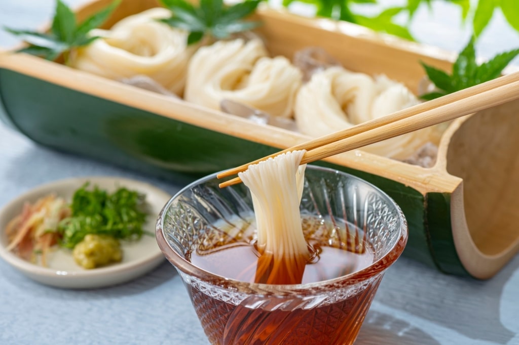 Somen, especially popular in western Japan, are ultra-thin noodles served chilled in ice water with mentsuyu dipping sauce. The fun variant nagashi somen involves catching noodles flowing down bamboo tubes.