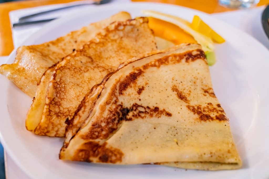 Often, they’re made with buckwheat flour, which gives them a slightly earthy flavor. Thinner than American-style pancakes and ever-so-slightly thicker than their traditional French crêpe, they’re such a superb vehicle for maple syrup that after trying them, you may never be able to go back.