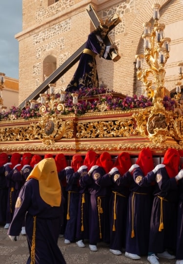 Depending on where you are, you will see parades of church brotherhoods bearing elaborate statues that tell the story of the Passion of Christ. Highly decorated floats move slowly through the crowds. Locals dress in costume, ranging from the garb of the brotherhoods to mysterious looking penitents, or nazarenos, some of whom are barefoot or carrying large wooden crosses. The penitents are often followed by women dressed in black and wearing elaborate headdresses. Special songs, called saetas, with their origins in flamenco, are sung.