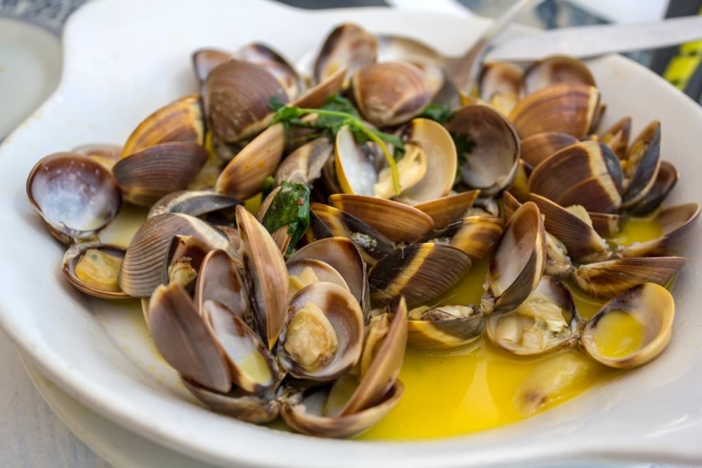 Amêijoas (clams) are beloved in Lisbon, unsurprisingly, as the city’s Tagus River is teeming with them. For this dish, the clams are cooked in quality olive oil, garlic, cilantro, and seasoning before adding lemon juice, and occasionally wine, when serving.