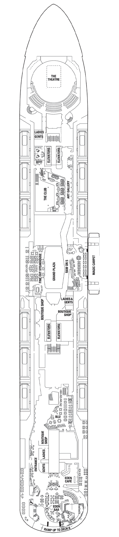 The industry-first Magic Carpet is both the best way to take in spectacular views and the most exciting place to be. By changing function and location, it provides an incredible array of visual perspectives and a distinct experience on every deck it visits.