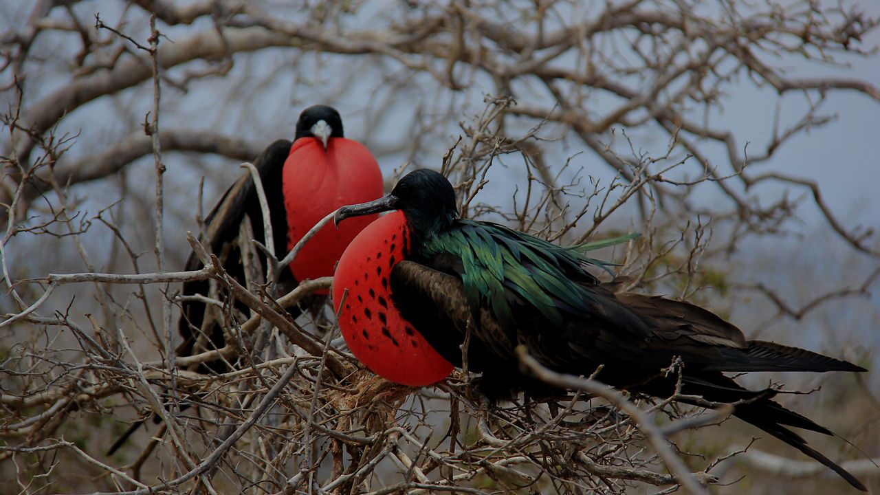 Go to SiteNorth Seymour Island has a lot to offer wildlife lovers. For starters, the largest colony of magnificent frigatebirds in the Galapagos makes its home here. Frigatebirds are also known as “pirate birds,” due to their proclivity for stealing food from other birds or snatching chicks out of their nests. They’re also exceptionally agile and acrobatic flyers, which no doubt aids them in their thievery. One of the bird’s most distinctive features is the male’s scarlet red throat pouch, which he inflates during mating season to attract female frigatebirds.
