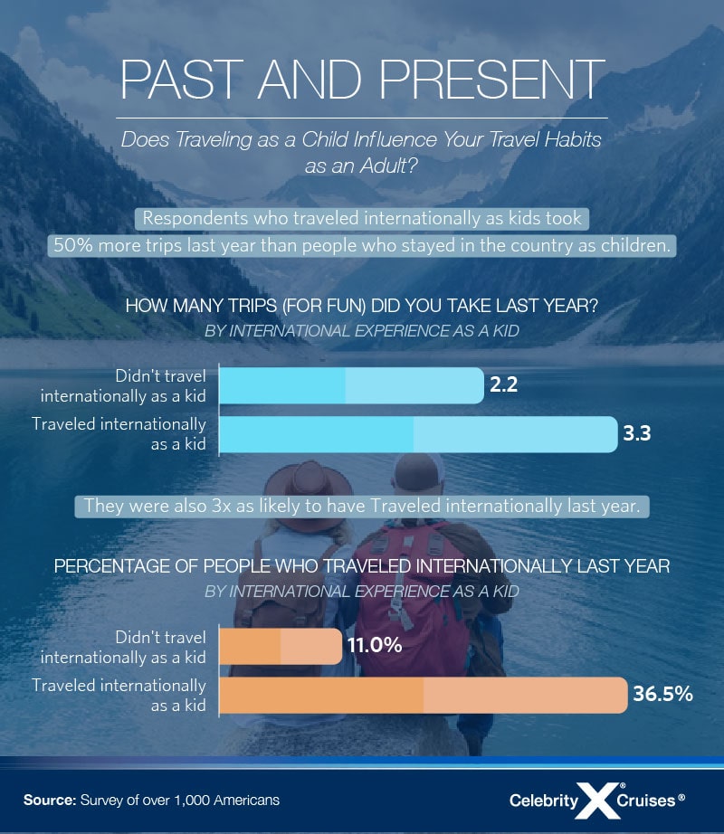 In some respects, the potential benefits of traveling as a child seem obvious: Direct experience of other cultures can transcend anything learned in a classroom, while family bonds can strengthen on the road. But those who go abroad as kids may also receive an entirely different gift – a lifelong love of travel. Respondents who traveled internationally as children were more inclined to take trips as adults: They reported 3.3 leisure trips each year, on average, as opposed to 2.2 trips for those who had not gone abroad in their youth.