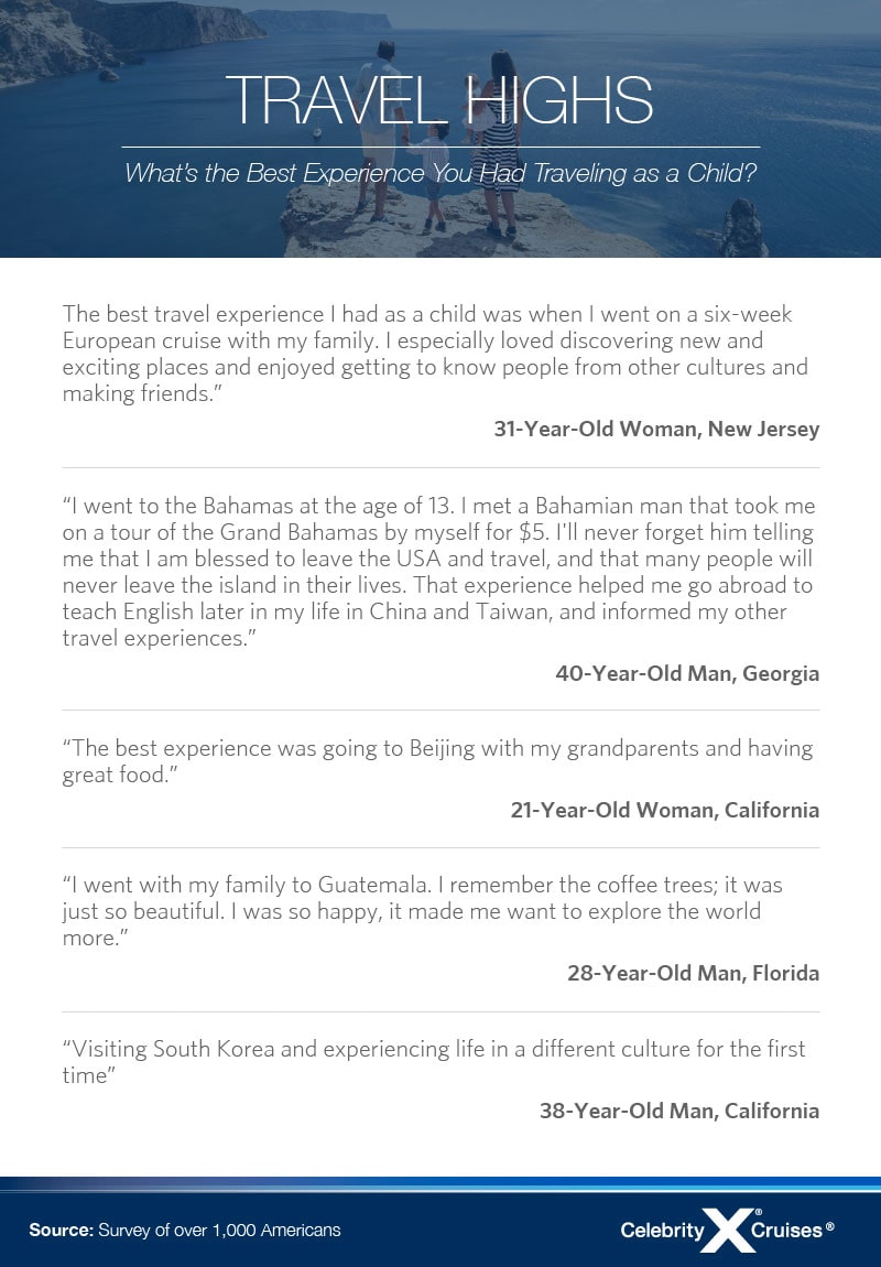 When we asked respondents to recall their most outstanding travel experiences from childhood, many described extended trips across multiple countries. One 31-year-old New Jersey resident recounted a six-week European cruise with her family in glowing terms, noting the lengthy trip allowed her to get to know others from different cultures. Similarly, a 49-year-old Massachusetts man mentioned visiting three European countries on a tour when he was 15 years old.