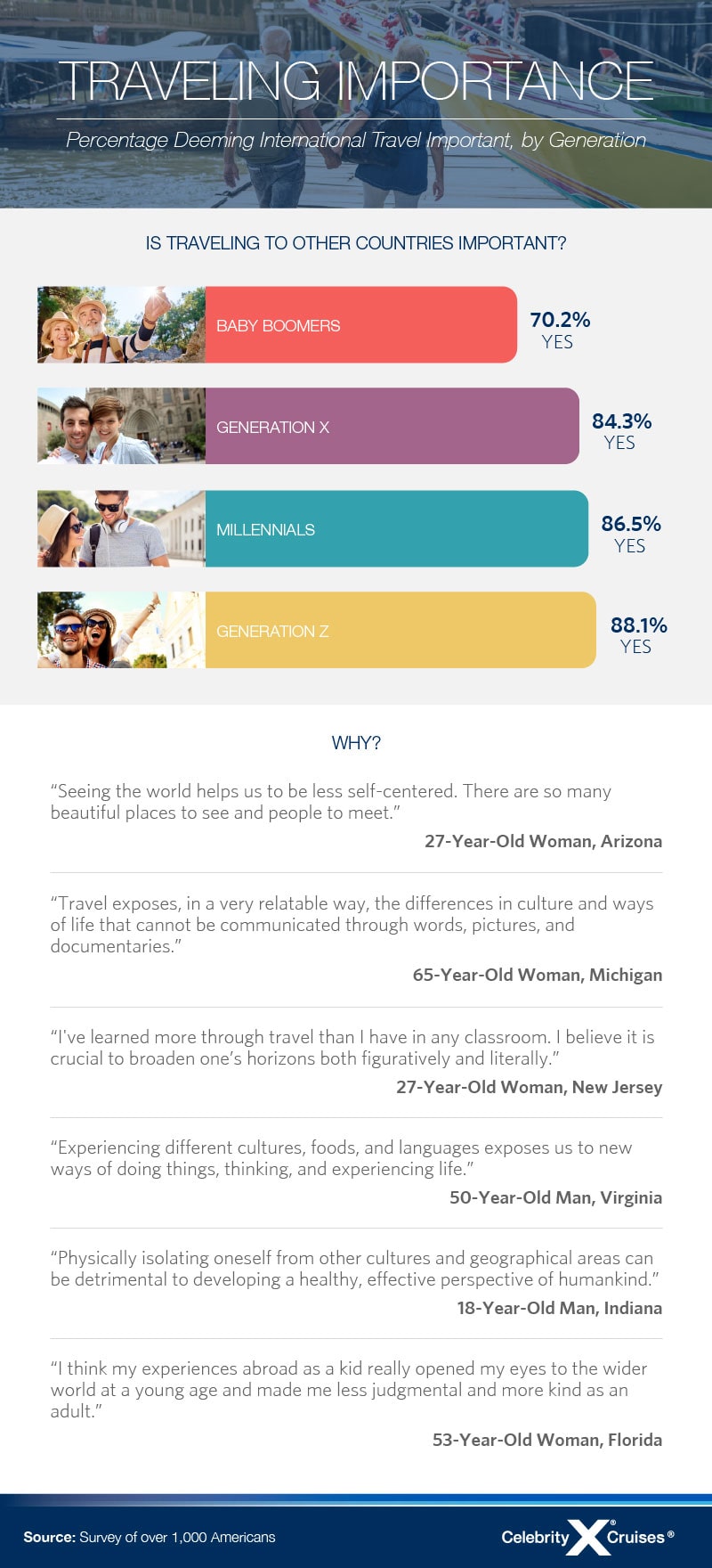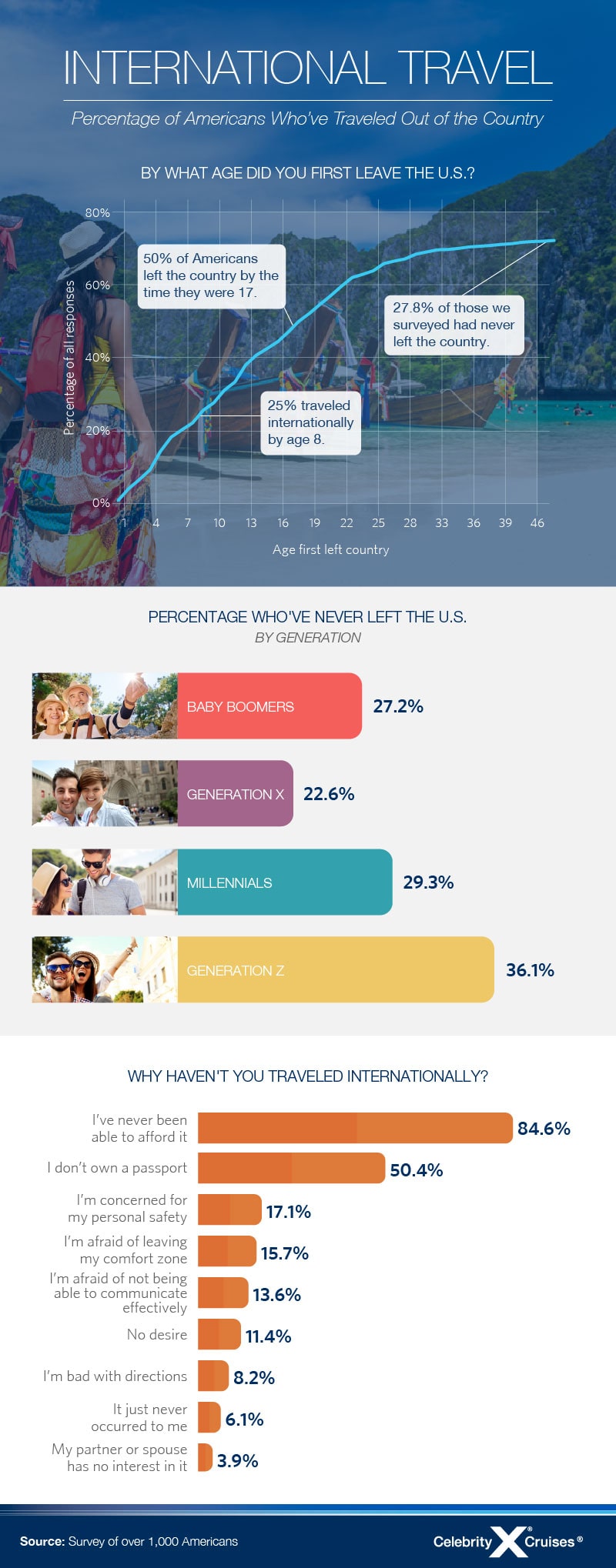 Among the individuals surveyed, the majority had ventured abroad: Less than 28 percent had never left America. In fact, half of respondents had traveled outside the U.S. by the time they turned 17, and a quarter had done so by age 8. Understandably, members of Generation Z and millennials had the highest percentage of respondents without international experiences: These young people may not have had the opportunity yet. However, 27 percent of baby boomers had also abstained from international travel, suggesting a longstanding lack of interest or ability. Their window of opportunity has not yet closed, though. Recent research suggests that nearly half of senior citizens hope to travel abroad in the near future.